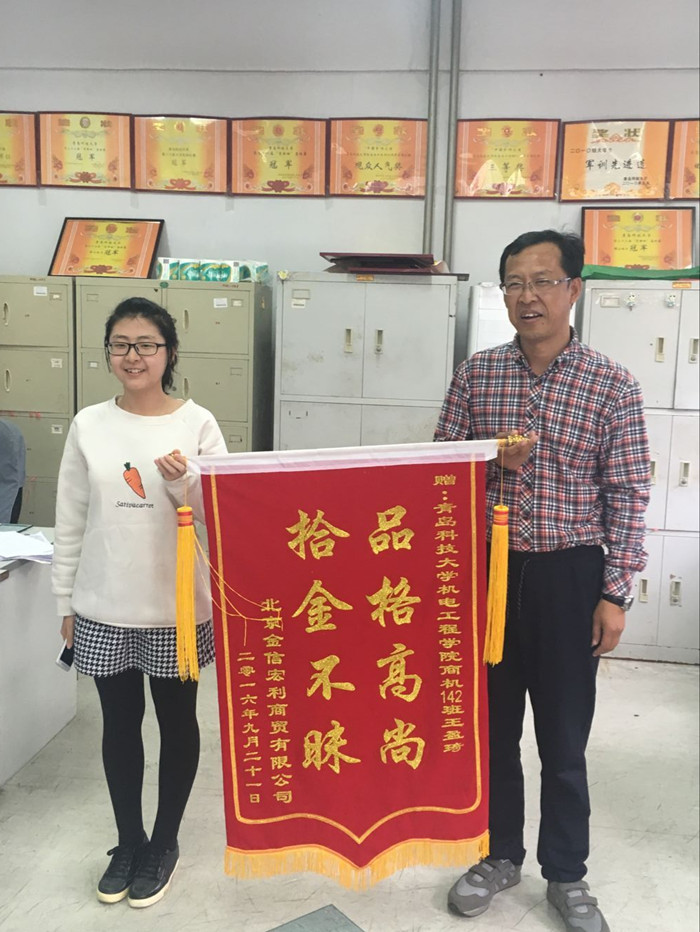 10月13日下午,机电无码人妻 收到了北京金信宏利商贸有限公司李金菊赠送的一面锦旗,锦旗上写着“品格高尚,拾金不昧”。